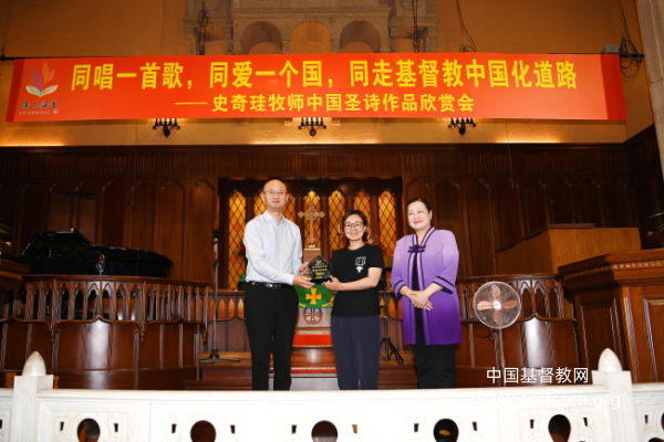 为感谢史奇珪牧师为圣诗中国化、基督教中国化所作的突出贡献,黄浦区委统战部副部长、黄浦区民宗办主任张晓杰和姜茜莉牧师一同向史奇珪牧师颁发了“特别贡献荣誉”,由家属代表代领了奖牌。
